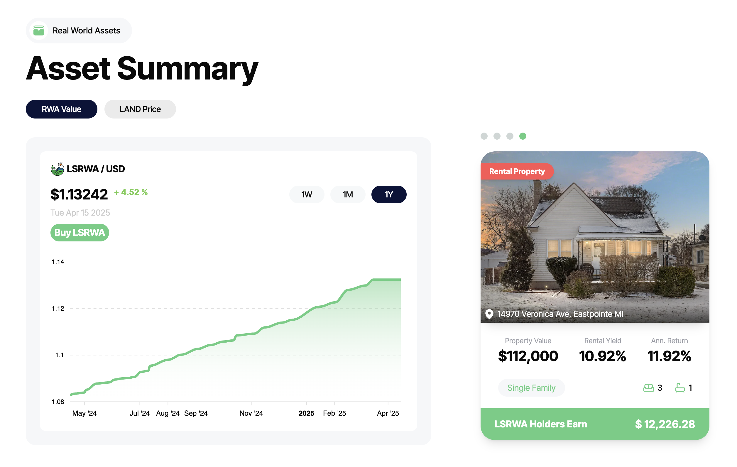 At the core of Landshare’s ecosystem is LSRWA, a token that represents a share of a pool of real-world, U.S.-based real estate assets. When you hold LSRWA, you're not just speculating — you're actually investing in physical properties that produce income and grow in value over time.