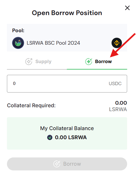 The process of borrowing USDC by pawning your LSRWA and LAND tokens is straightforward. Let’s walk through it:
